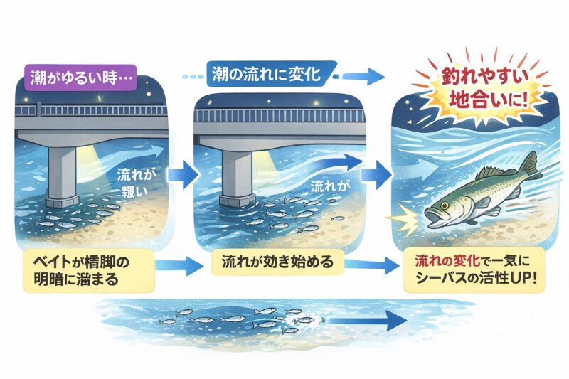 逆に潮が流れ始めたり、流れが変化した瞬間に急にシーバスの反応が出ることが何度もありました。